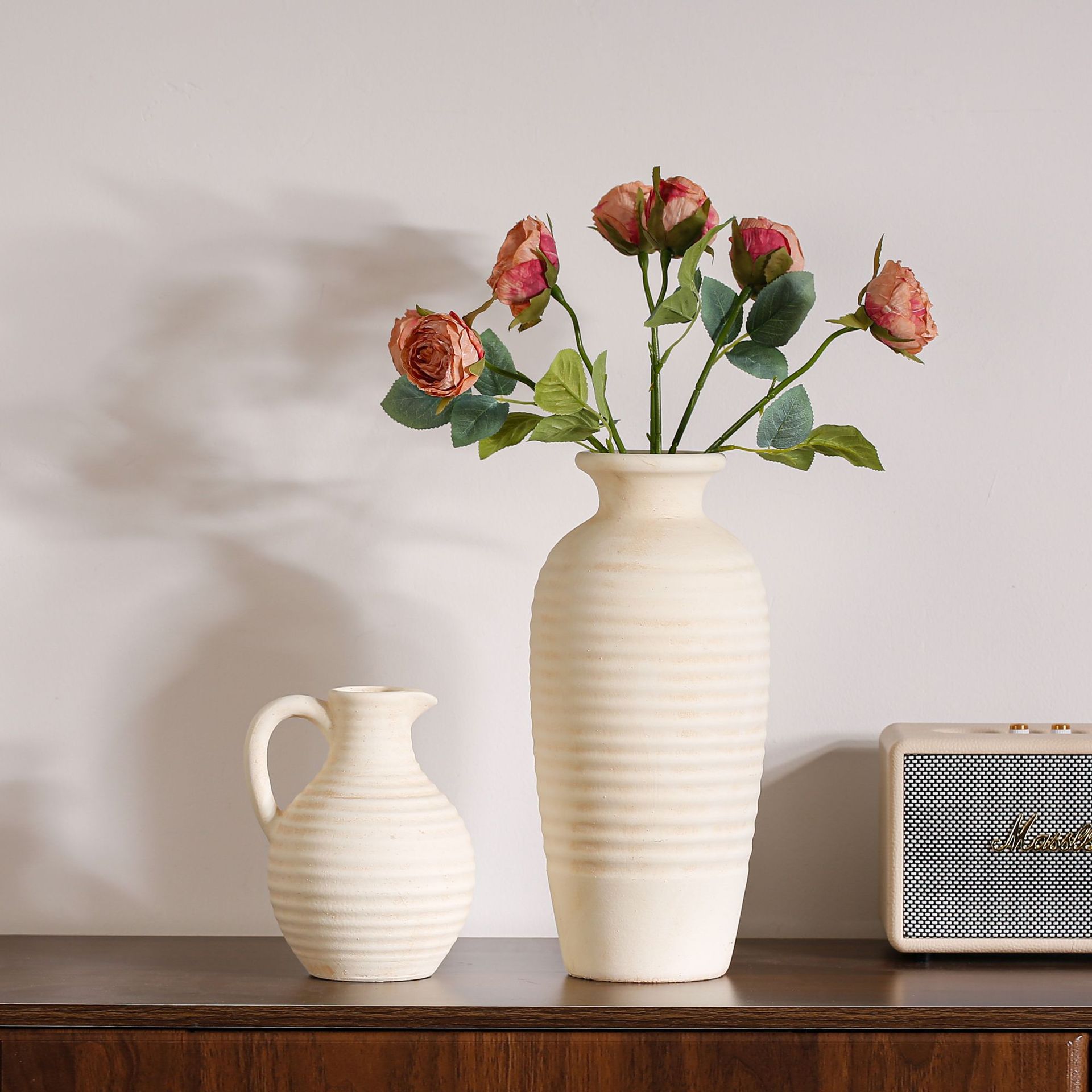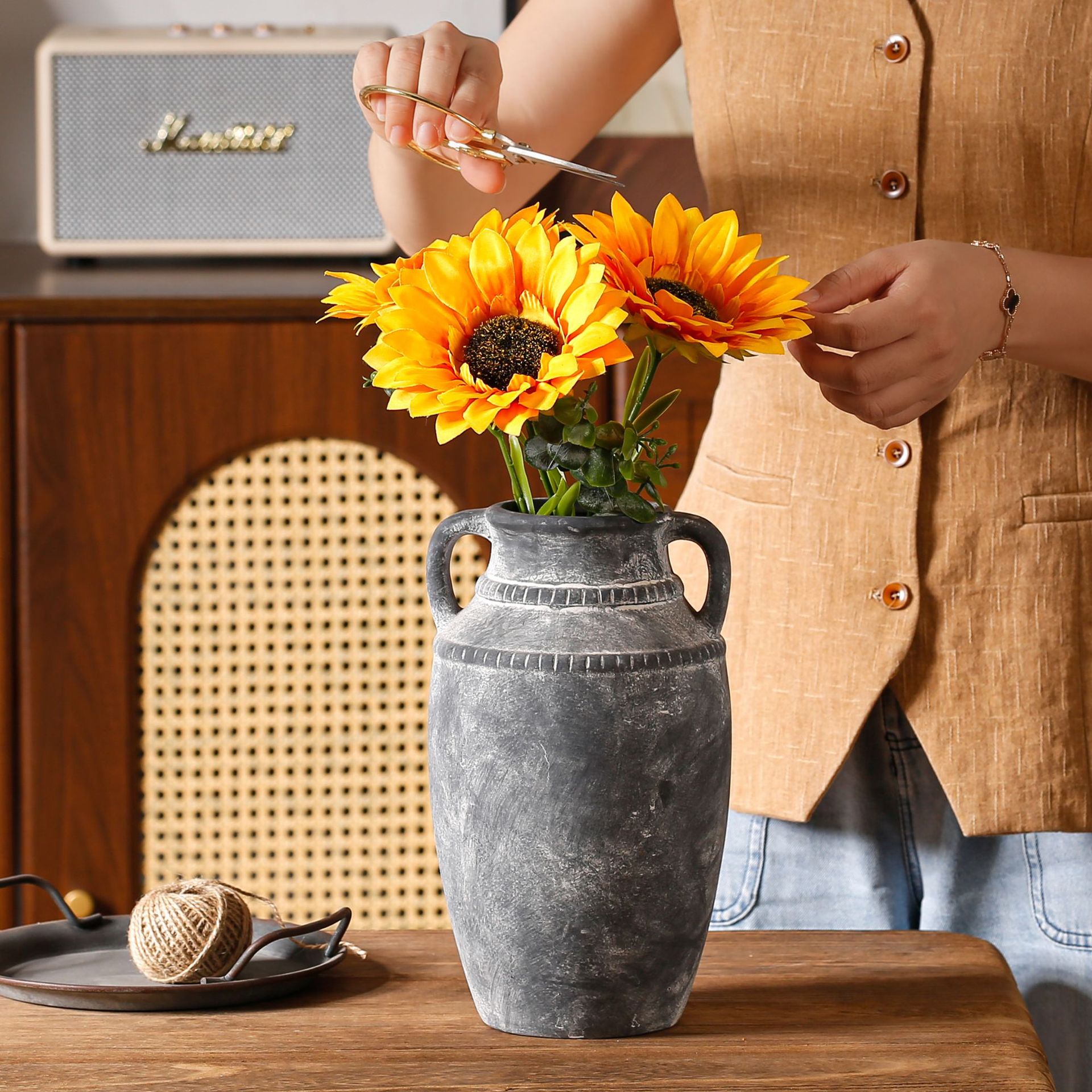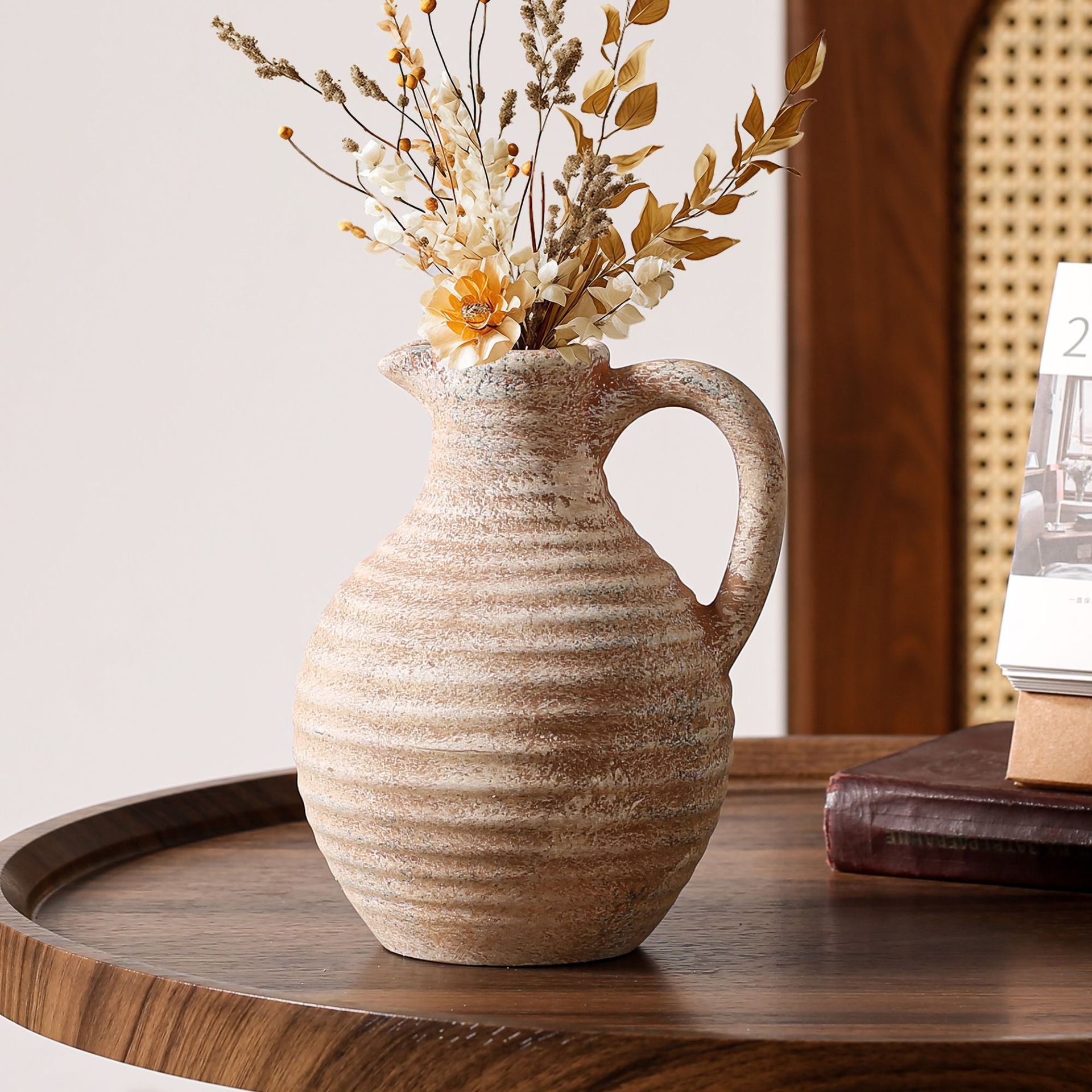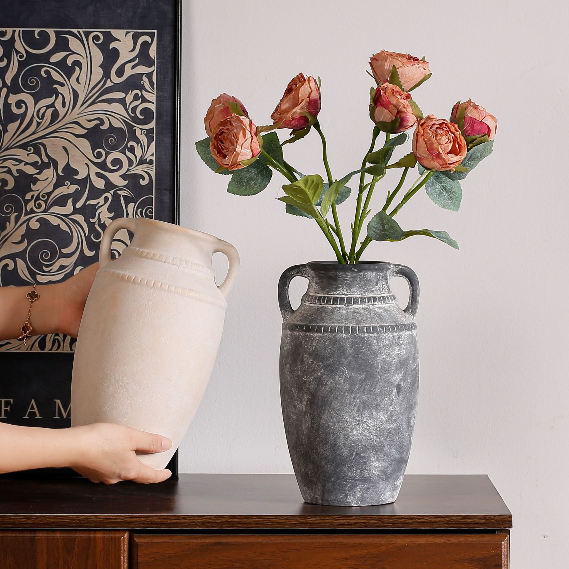 Ornamental flower arrangement, vintage ceramic vase with handles, flower arrangement utensil